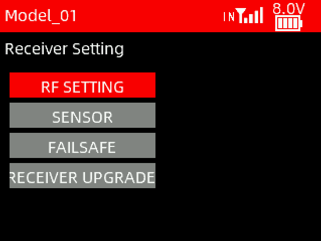 When T16D transmitter is used, mount the module on T16D. Enter Receiver Setting -> RF Protocol. Set the module to External, and select the corresponding protocol and baud rate, as shown below: