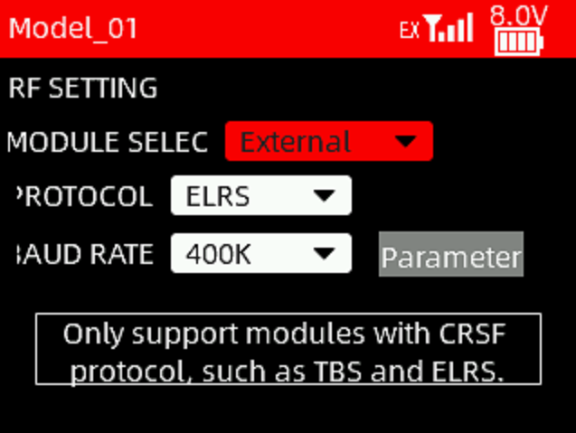 In OpenTX system, enter into MODEL SELECTION--MODEL SETUP. Turn off the "Internal RF". E enable"External RF" and select "CRSF" as the protocol, as shown below: