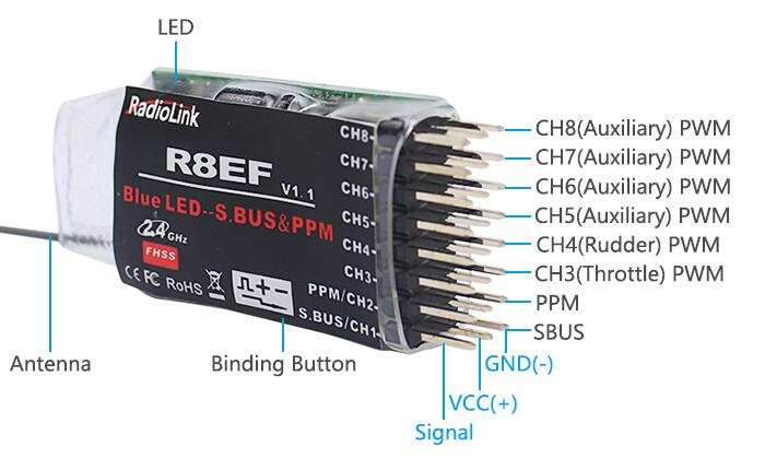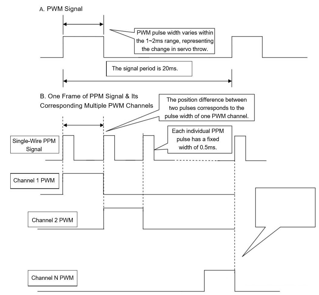 A PWM signal requires one wire per channel. Multiple channels require multiple wires. For applications needing multiple channels, such as connecting to a flight controller or a computer simulator, where multiple channels need to be transmitted through a single wire, PWM is not suitable. This led to the development of PPM (Pulse Position Modulation). (For an example, see the Radiolink R8EF 2.4G 8-channel receiver.)