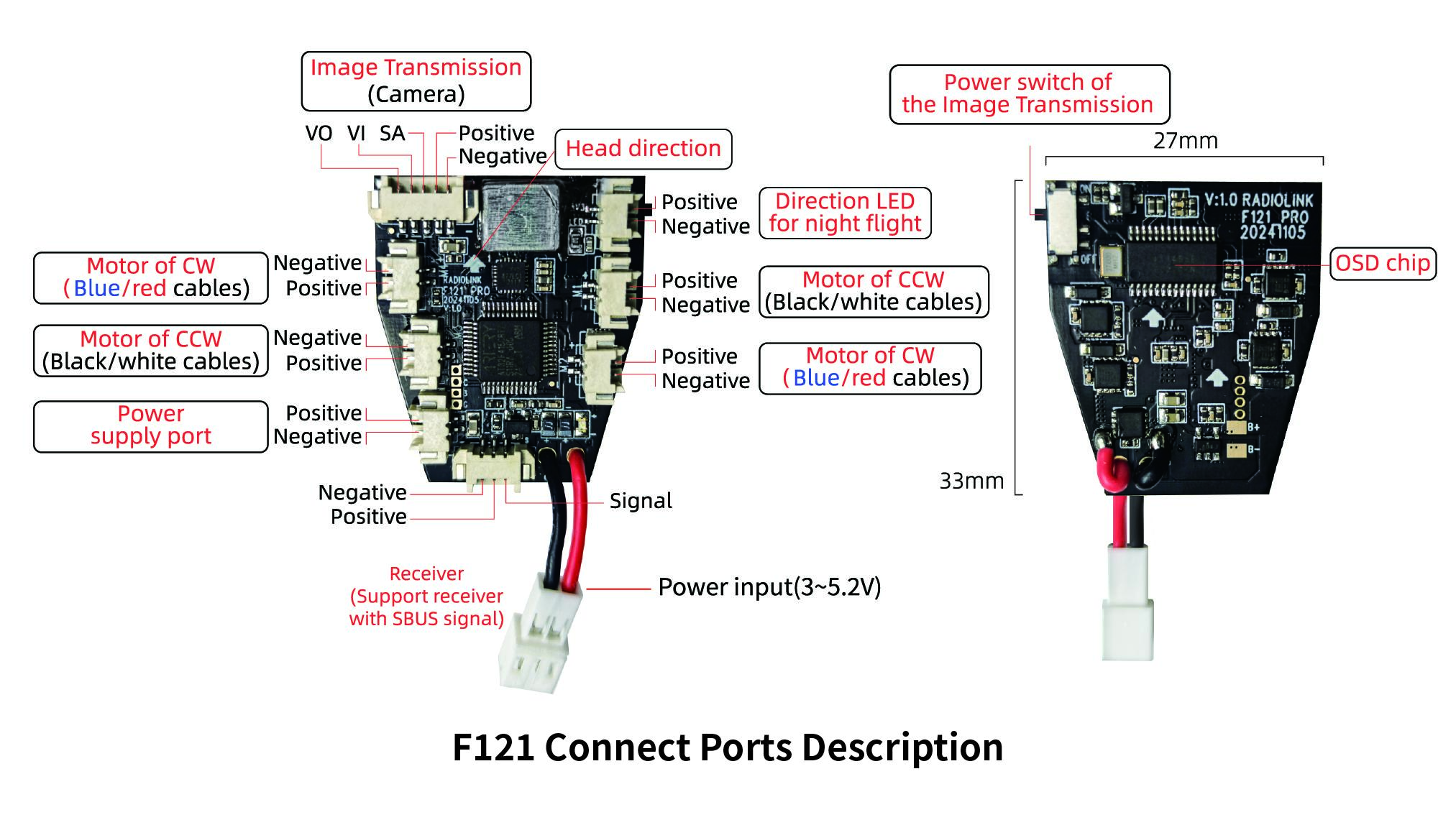 Make sure the signal output of receiver is SBUS to ensure normal operation of F121. For RadioLink receivers(R8SM/R6DSM) installed on F121, the led indicator is blue/purple when it’s SBUS working mode.