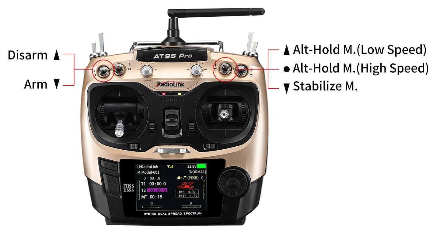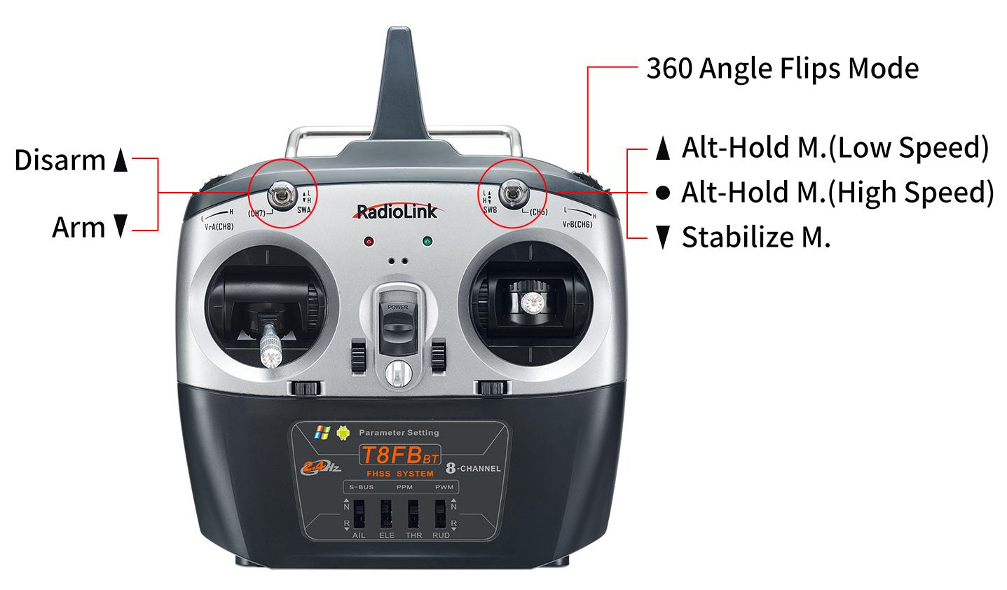 There are three flight modes for F121 including Altitude Mode- Low Speed, Altitude Mode- High Speed and Stabilize Mode. The flight modes can be switched by pressing the three-way switch on T8FB- SWB or T8S- CH5, and T8FB- SWA or T8S- CH7 is used to arm/disarm the aircraft, as shown below: