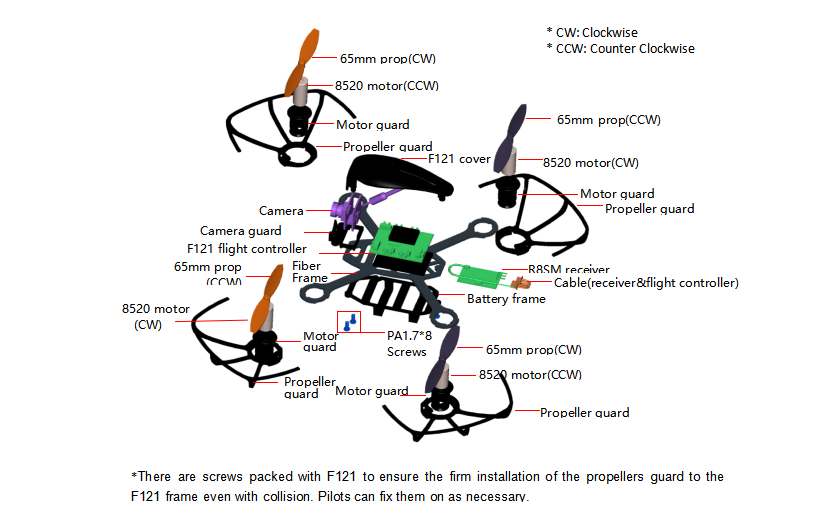 To make the aircraft fly, motors usually rotate clockwise(CW)/counterclockwise(CCW) with the propellers. The rotation direction of F121 motors can be identified by the cable colors. That is, red/blue means motor of clockwise(CW) while black/white means that of counterclockwise(CCW). It is very important to make sure about the rotation direction as below when installing motors. Otherwise, the drone would fail to take off.