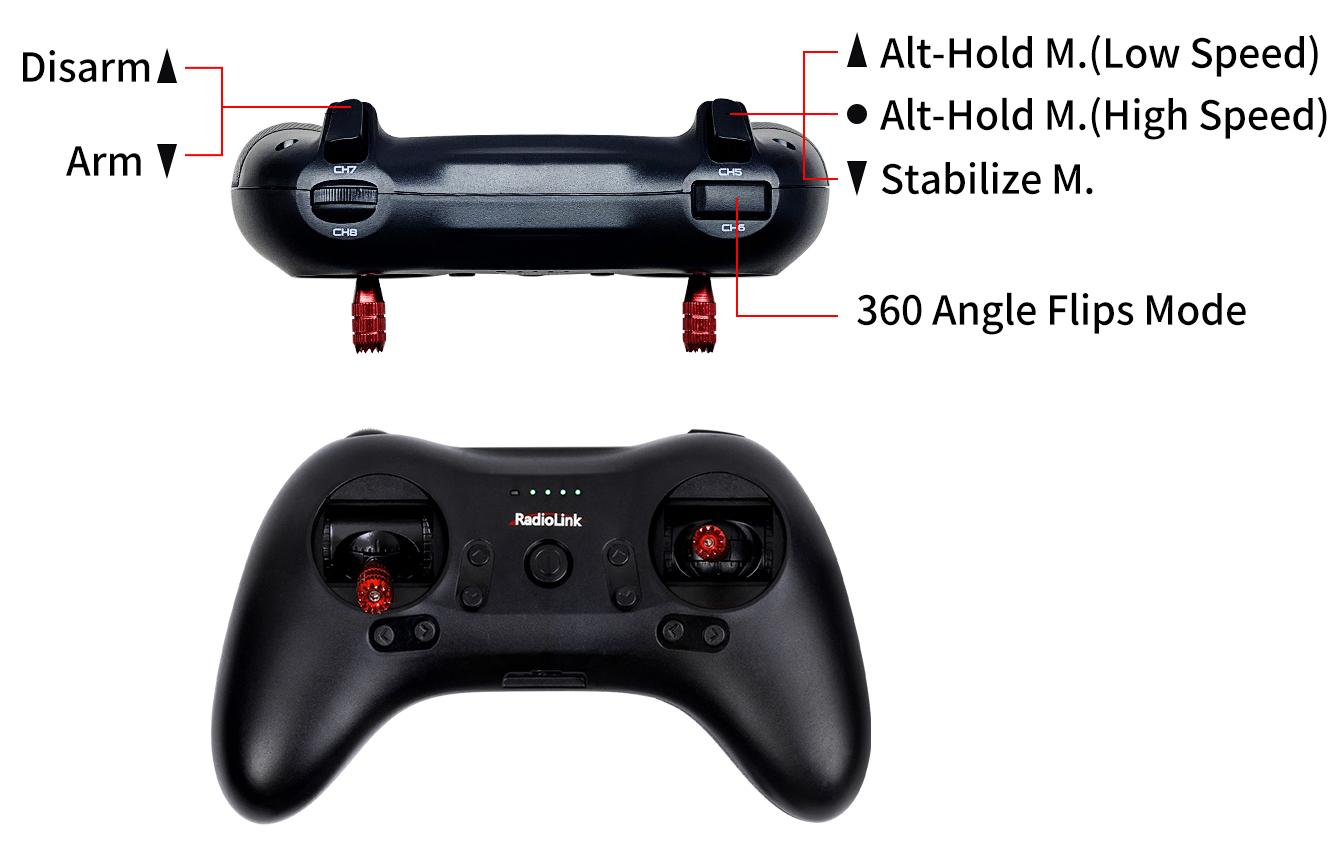 Note If it’s the transmitter from other brands used with RadioLink F121, make sure that the receiver should be SBUS signal output supported. Once the receiver is installed on the mini drone, the phase of the throttle should be reversed while the other three channels normal and the CH5 should be set with a 3-way switch. Servo phases of transmitters from other brands should be set according to the actual situation.