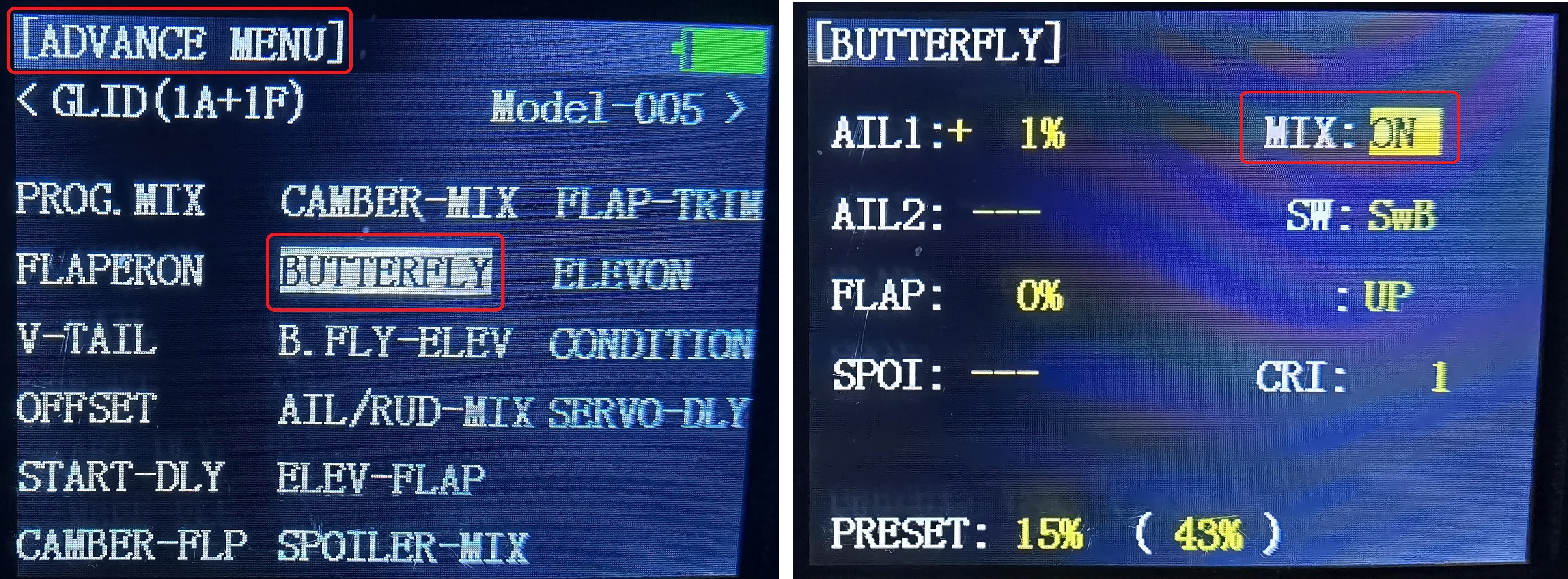 5. Into ADVANCE MENU—select BUTTERFLY menu