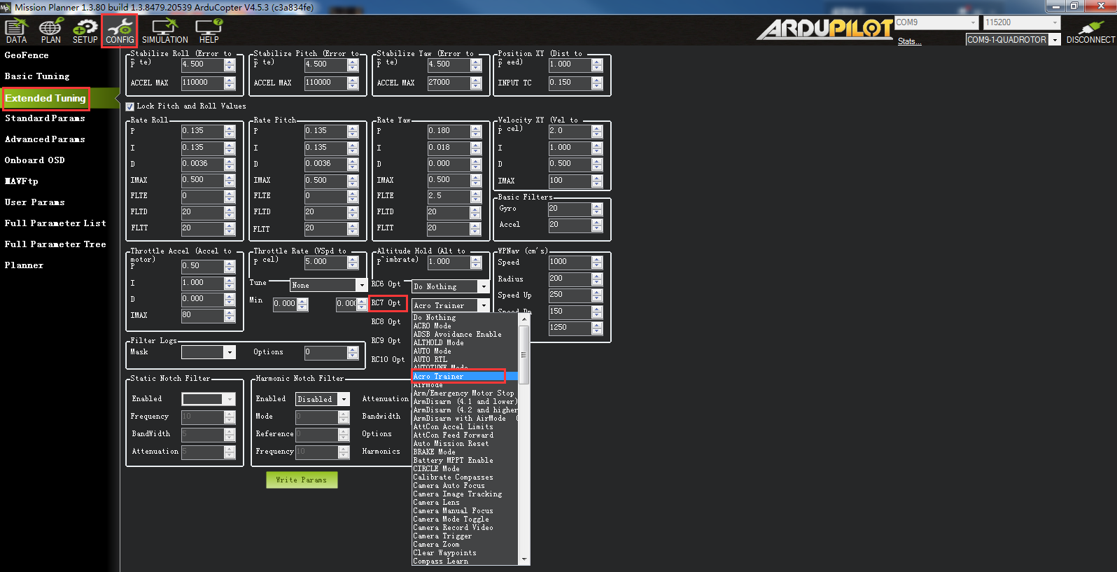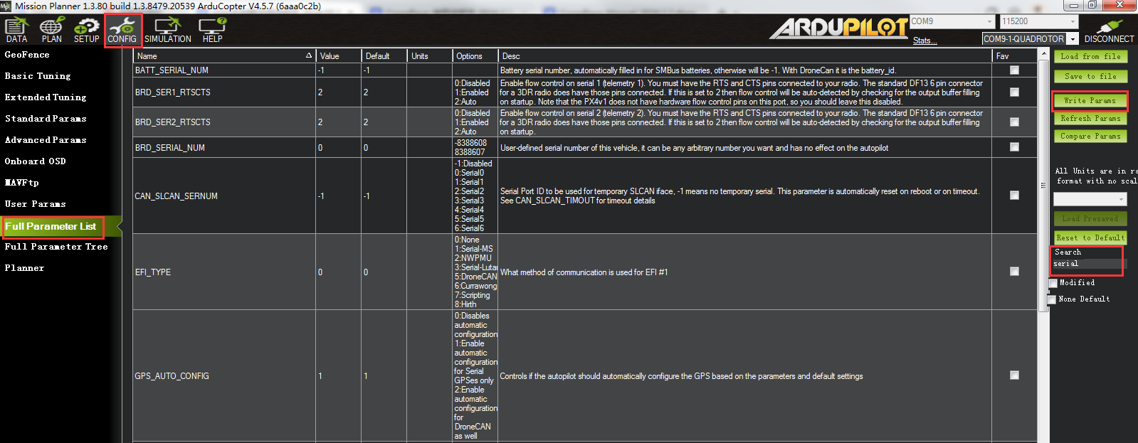 All settings of the flight controller can be set or adjusted. You can enter Full Parameter List to search the parameter you want to modify and then modify it. After the modification, please remember to click Write Params on the right.