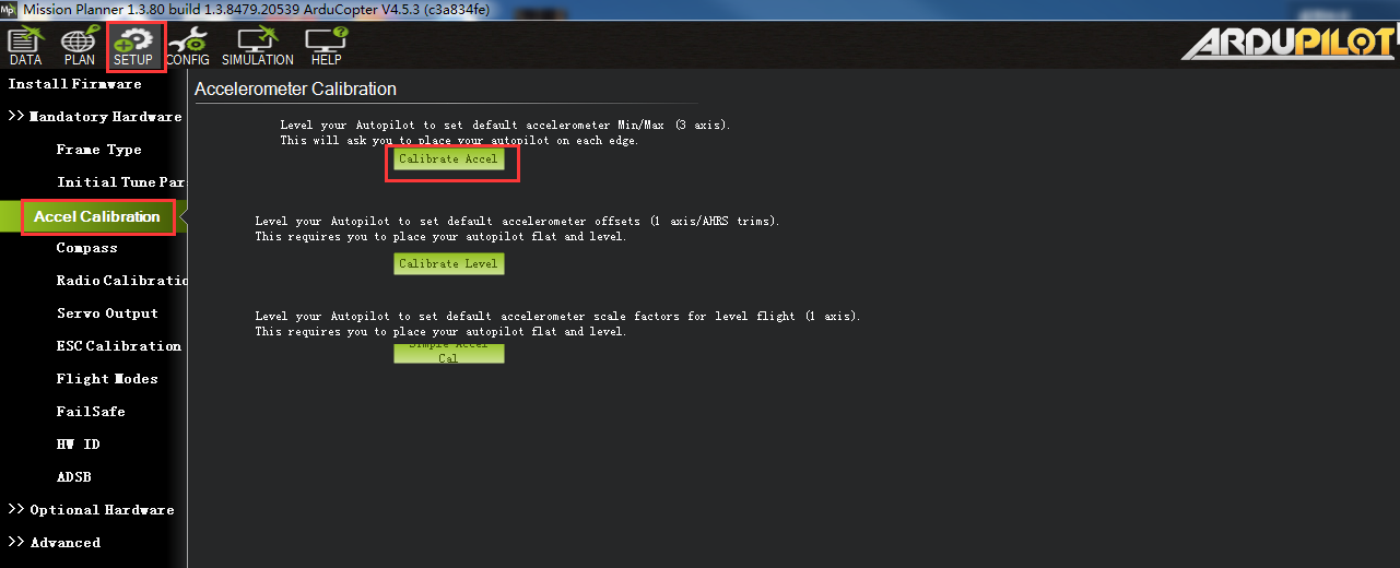 Connect flight controller to Mission Planner, and connect receiver to finish the calibration of transmitter, Accelerometer and compass.