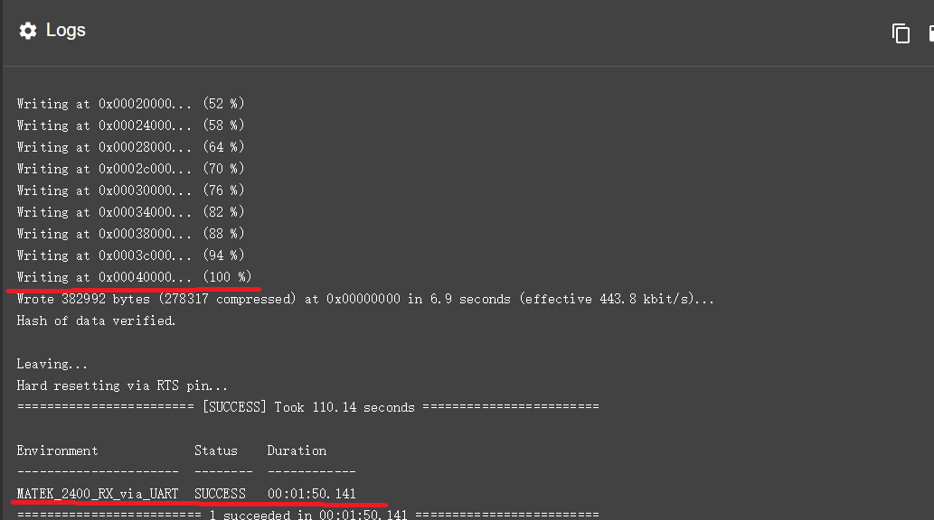 15.在Logs框能看到整个编译进程,当出现下面页面时,表示已将程序下载进接收了。在Result下也能看到绿色的Success!