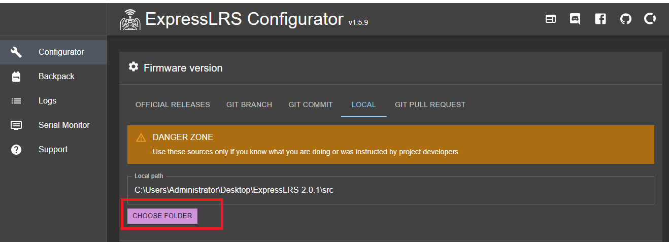 本示例采用下载官方发布固件到本地,使用ELRS编译下载固件。默认出货固件版本为:ExpressLRS-3.3。