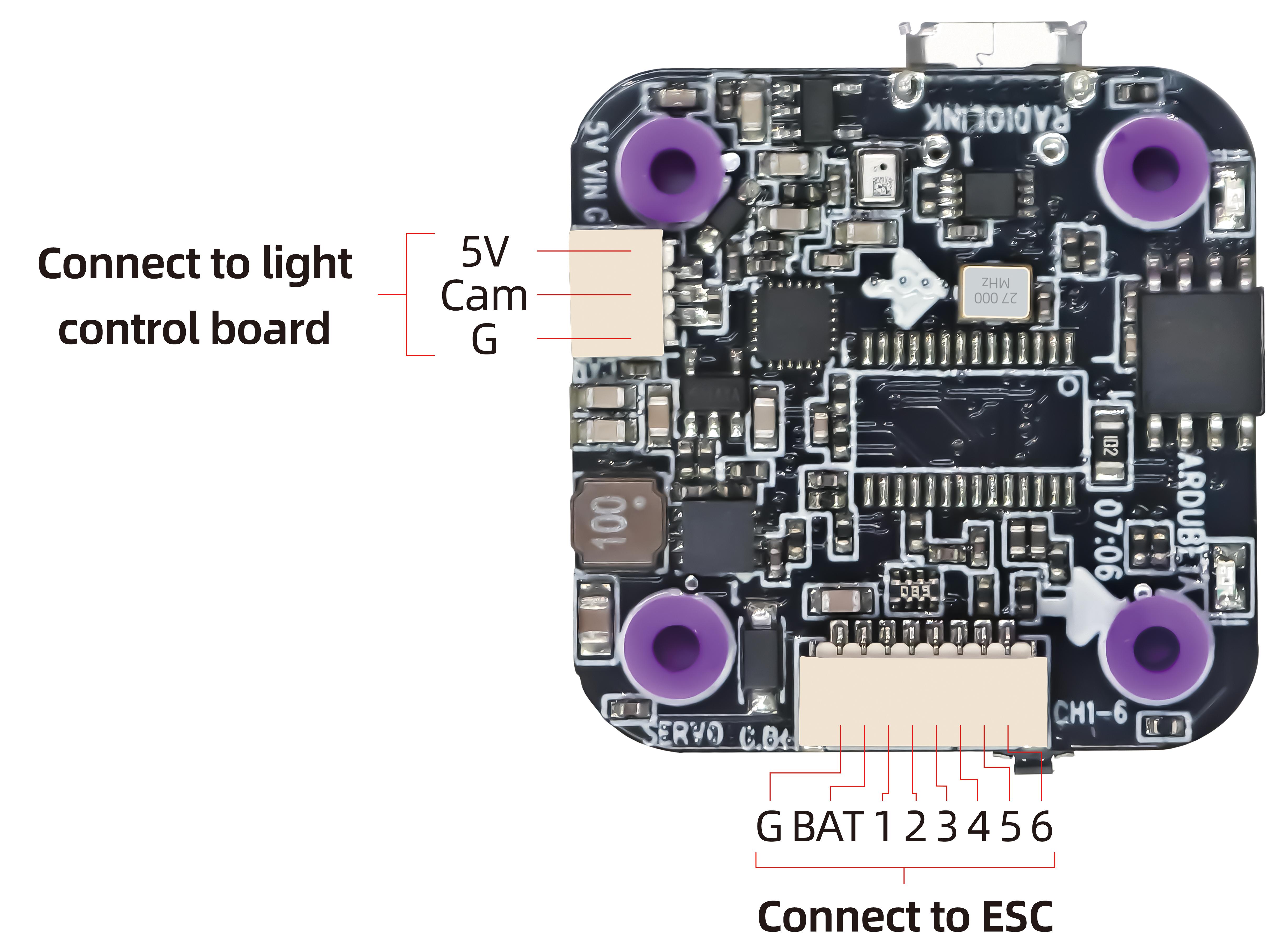 For LD-B20 PNP version, uses need to prepare the transmitter and receiver. The receiver needs to connect to the flight controller. Here is the socket introduction of the flight controller of LD-B20: