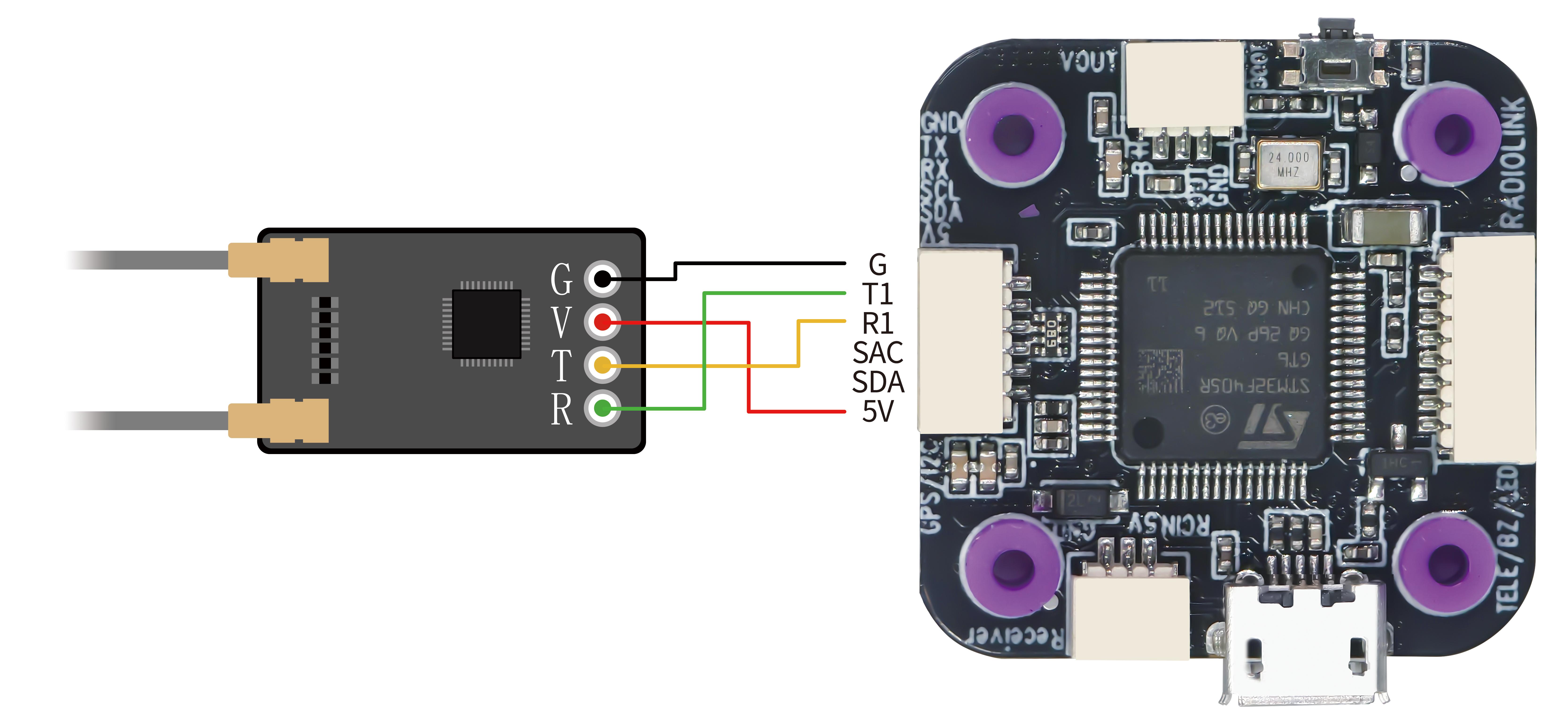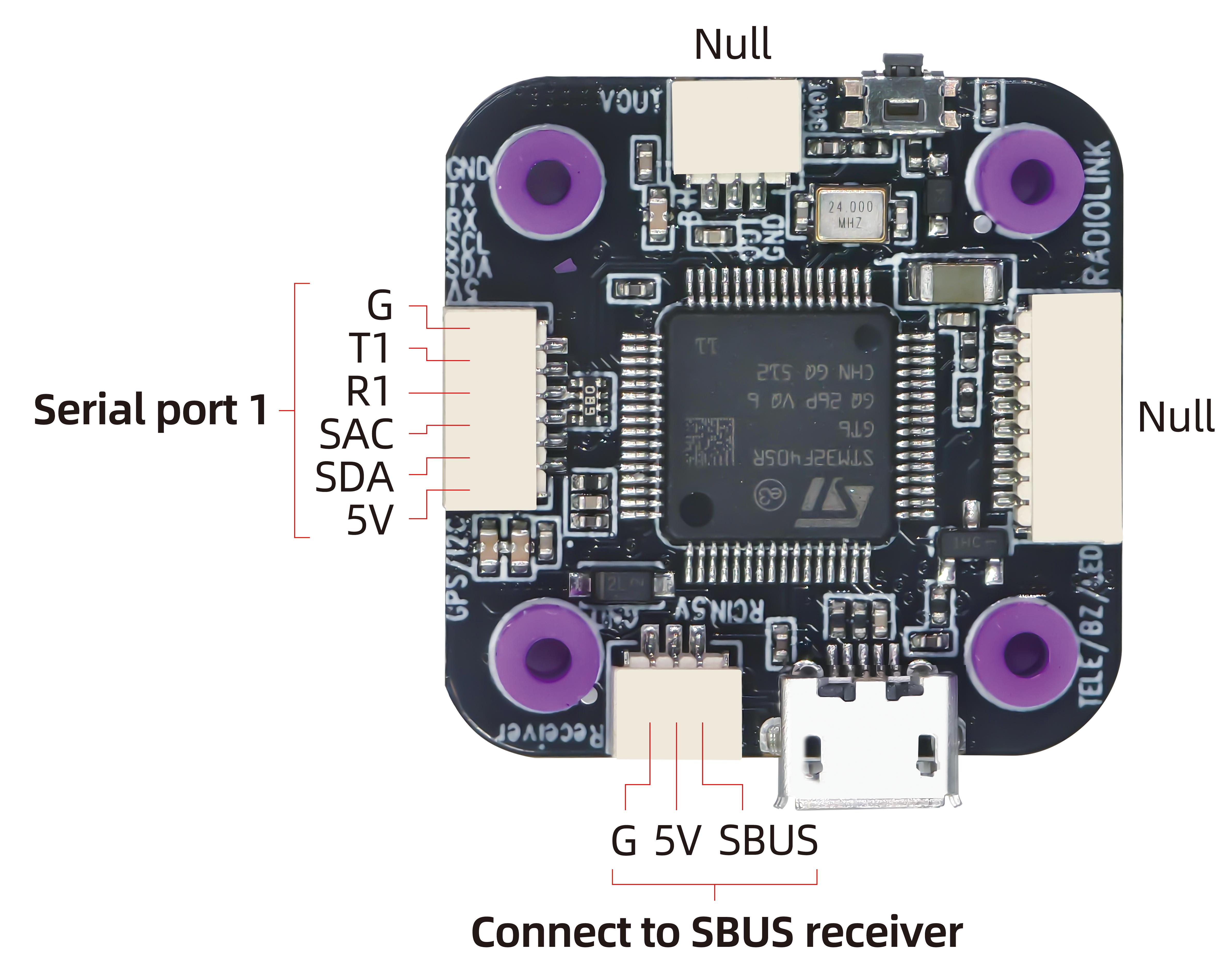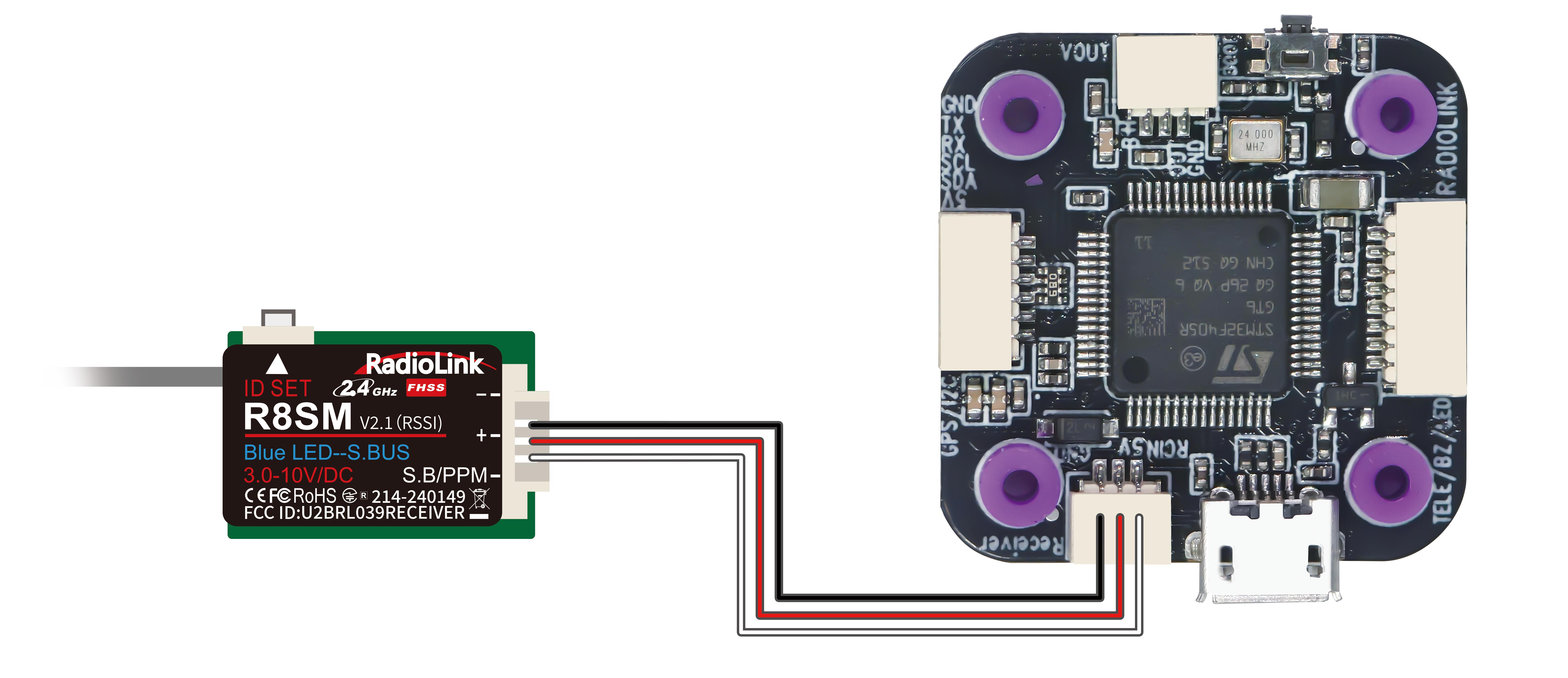 If SBUS receiver is used with LD-B20, please connect SBUS receiver to the SBUS receiver connect port of the flight controller (As shown below. RadioLink R8SM receiver is used as an example). Since the factory configured receiver serial port is serial port 1 (for ELRS receiver), you need to modify the settings when using the SBUS receiver, otherwise there will be conflict between the SBUS serial port and the ELRS receiver serial port, resulting in the failure of the communication between the transmitter and receiver.