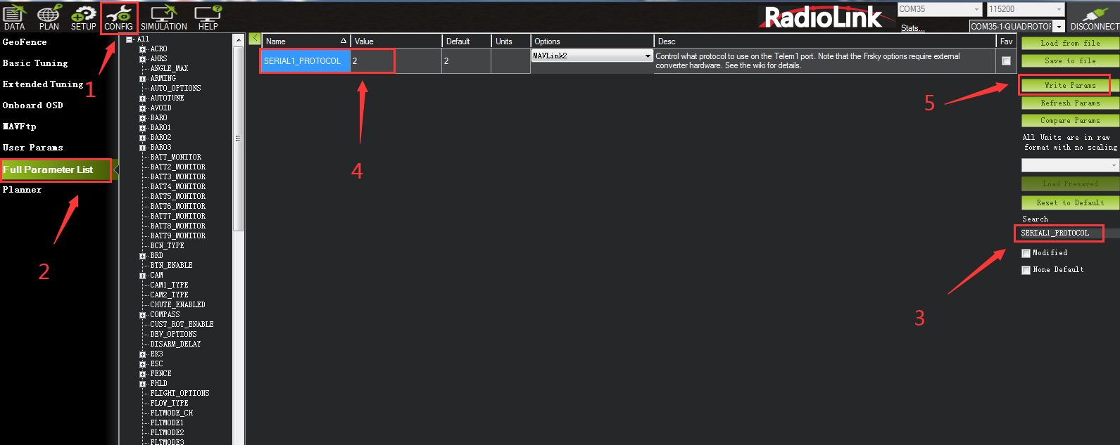 Please connect the flight controller to Mission Planner. Click CONFIG--Full Parameter List. Search for SERIAL1_PROTOCOL, and change the value from 23 to 2, and then click Write Params. The steps are shown below: