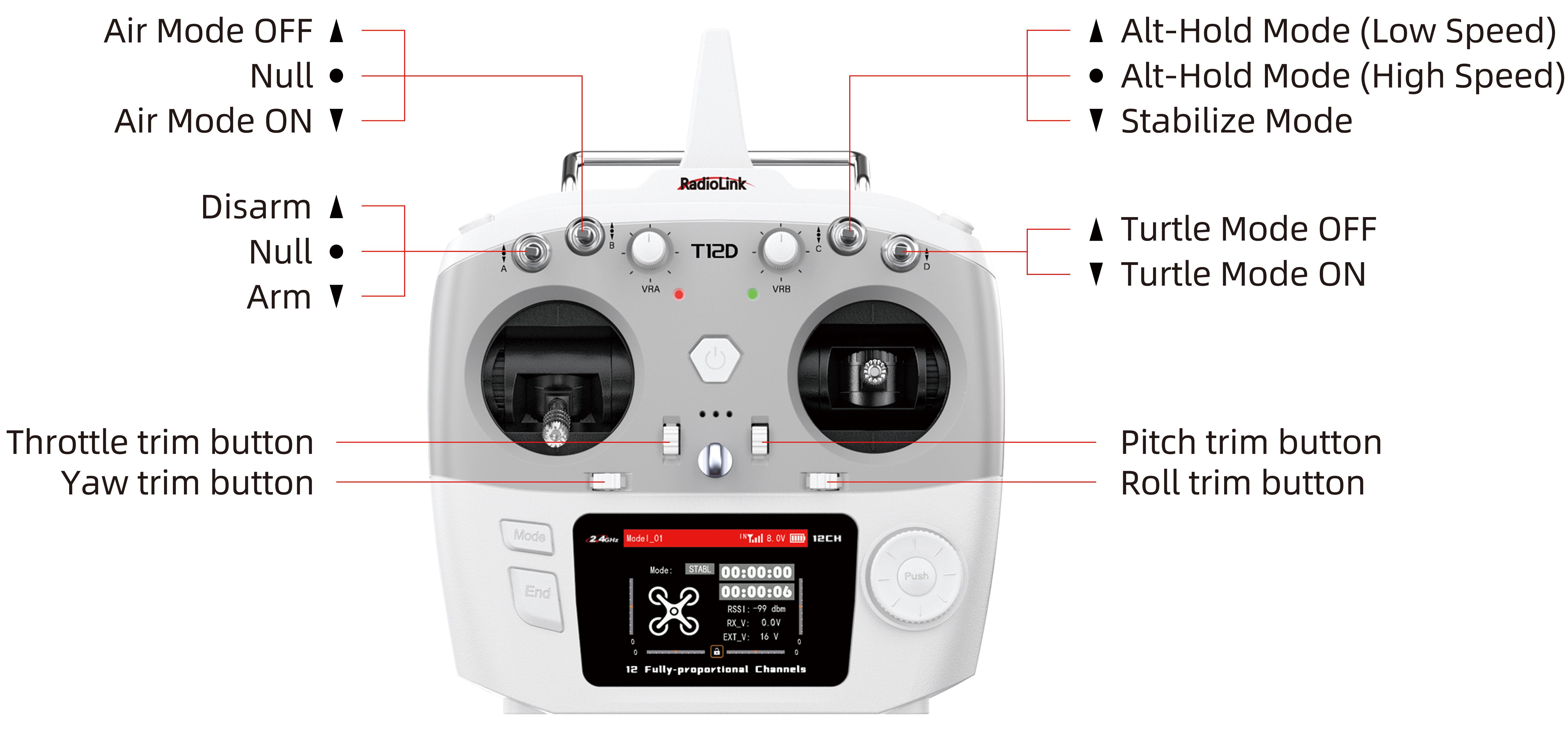 Note: All of the following are based onT12D Mode 2 (Throttle on the left stick).