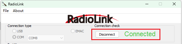 Click Disconnect, and the green "Connected" turns to red "Disconnected" which means the T8S/T8FB is disconnected from the firmware upgrade tool. Then disconnect the USB cable, turn on the T8S/T8FB, and connect to the parameter setup APP can check the firmware version.