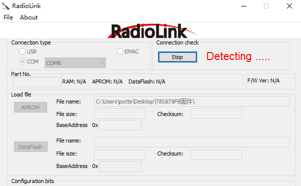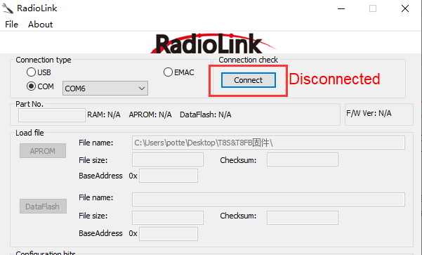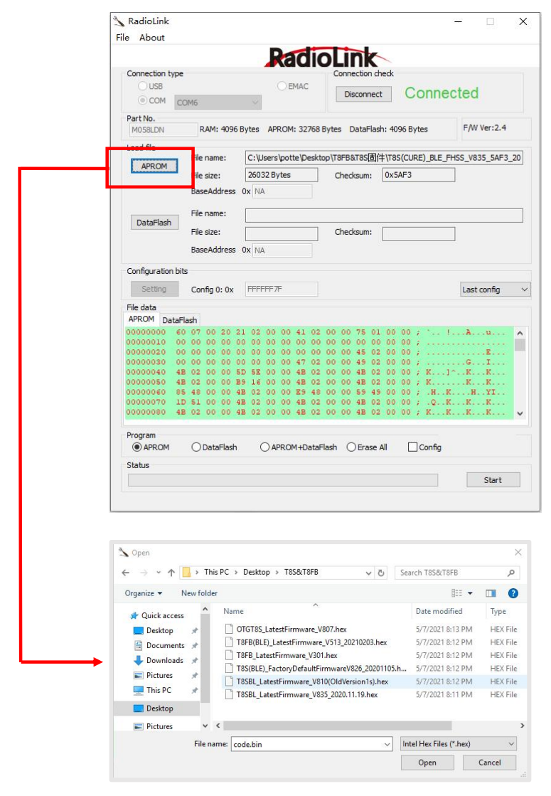 After T8S/T8FB is connected with the firmware upgrade software successfully, click the “APROM” button to select the correct firmware.