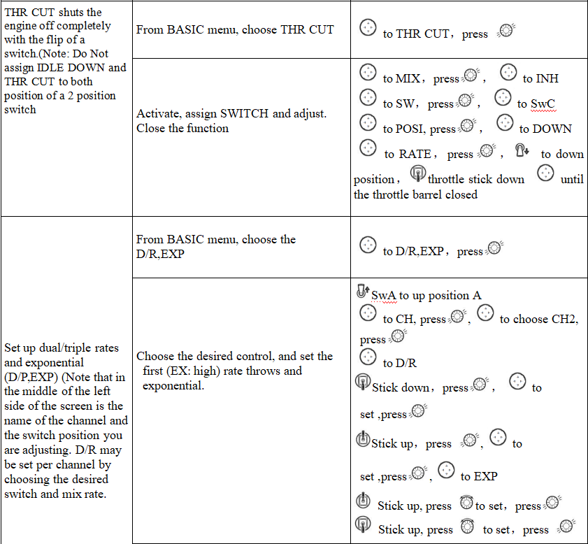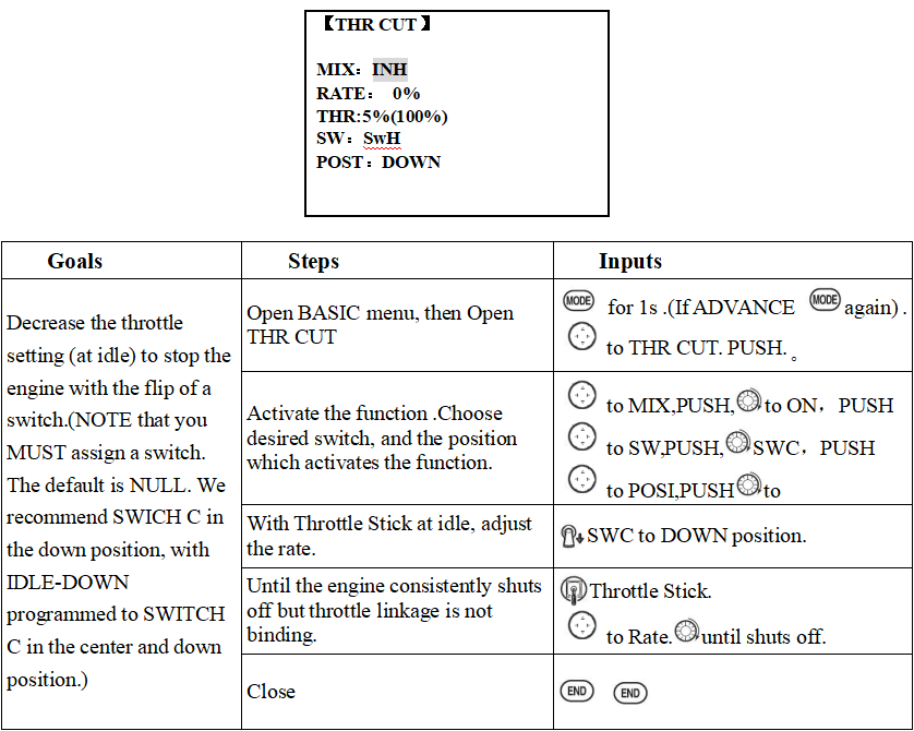 •IDLE- DOWN (ACRO), THR-CUT (ACRO HELI) (engine shut off), and MOTOR CUT (GLID) setups to allow precise engine/motor control for taxi and landings.