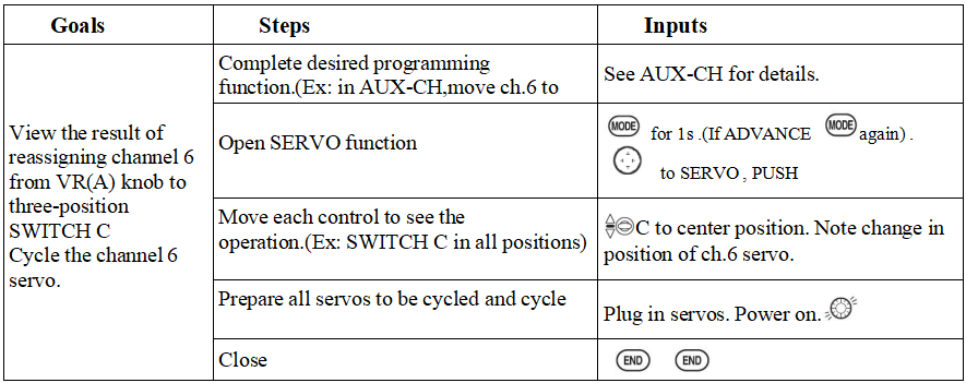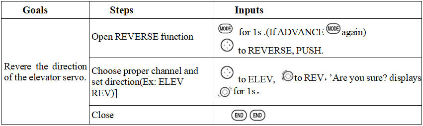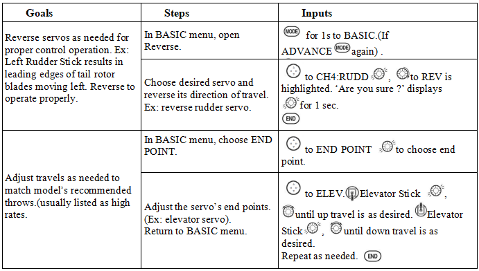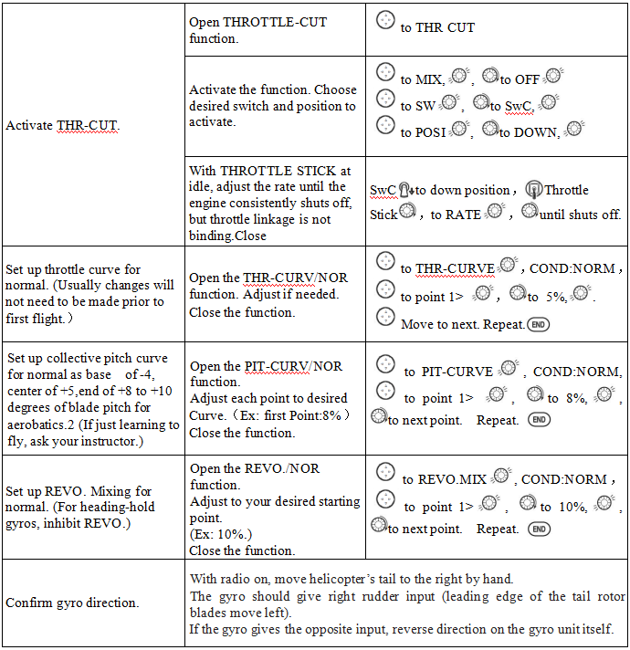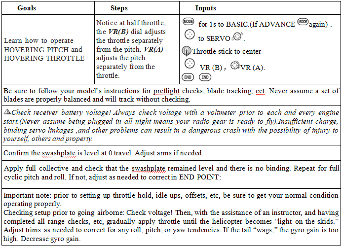 The necessary elevator offset varies with model geometry, so it must be determined by noting collective pitch changes at high speed. The rudder offset is affected by both revo. mixing and trim lever movement while in the offset function.