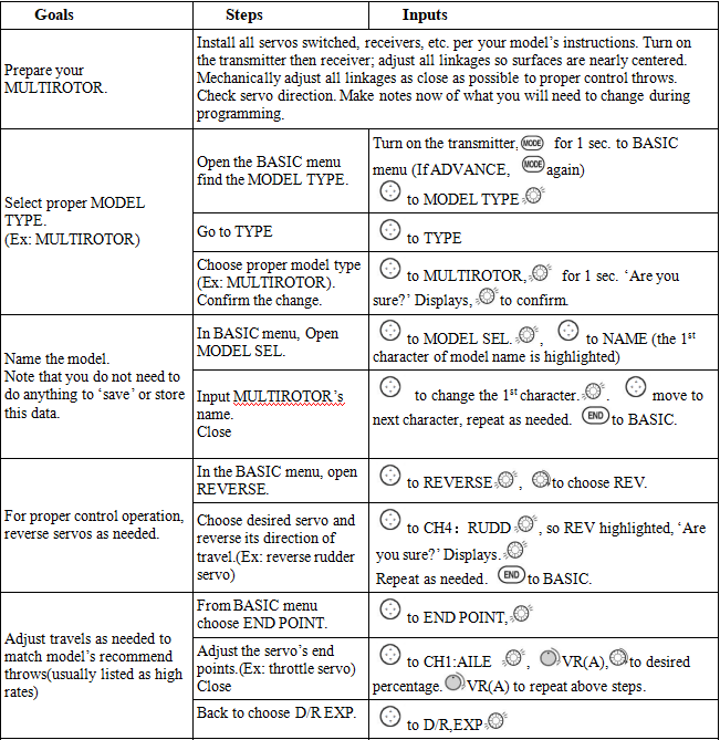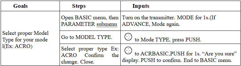Switch/Knob A or H | Airplane (ACRO) | Sailplane/Glider (GLID) | Helicopter (HELI) | MULTIROTOR |