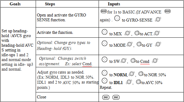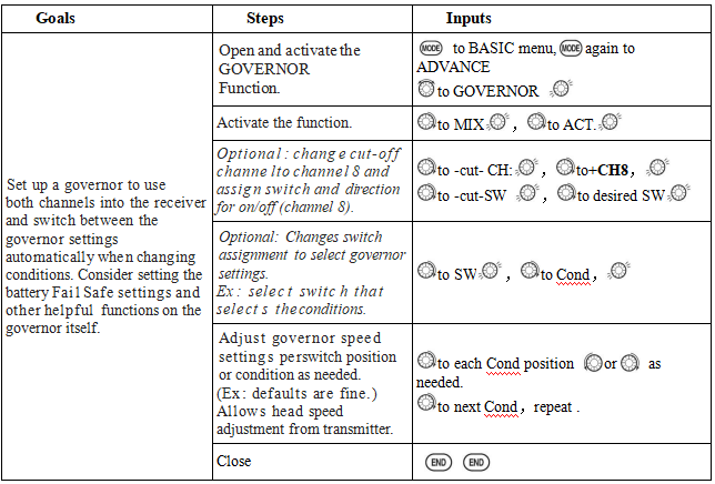 • Governor settings may be set up to follow Normal/Idle1/Idle2, but do not offer a setting to adjust for each of the 5 conditions like gyro.