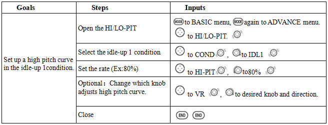 • PIT-CURV/NOR: inputs the normal (NORM) collective pitch curve, the collective pitch curve for flight near hover. The normal collective pitch curve is adjusted to match the throttle curve, providing the best vertical performance at a constant engine speed, with a starting curve of 4 base, +5 neutral, and +8 to +10 degrees of blade pitch maximum. You can program the response over a 7-point curve for the best collective pitch angle relative to THROTTLE STICK movement.