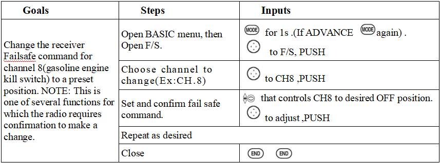 The GV-1 controls throttle when it is active, so the throttle will not obey any Failsafe settings preset for throttle in the transmitter. Always set the Failsafe setting for the GV-1's on/off channel to OFF. This way the governor is shut off and the throttle obeys the Failsafe throttle commands.
