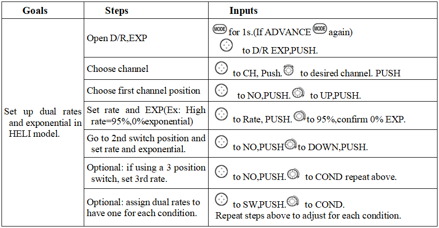 Additional flight conditions are available specifically for helicopters. These additional flight conditions contain different throttle curves, collective pitch curves, revo. mixing, and trims (except IDLE-3) to make the helicopter perform certain maneuvers more easily. Lastly, the gyro and dual rate functions may be set to provide separate rates per condition selected, including one for each idle-up.