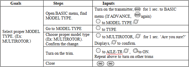 Different from ACRO, GLID AND HELI, MODEL TYPE for MULTIROTOR has an additional function TRIM, which is controlled by the VR switch. Set the TRIM OFF to avoid a mis-operation damage to the model.