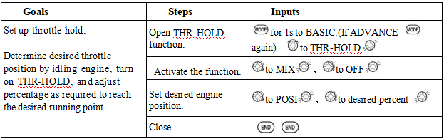 This function holds the engine in the idling position and disengages it from the THROTTLE STICK when SWITCH AT10II is moved. It is commonly used to practice auto-rotation. Prior to setting up THR-HOLD, hook up the throttle linkage so that the carburetor is opened fully at high throttle, then use the digital trim to adjust the engine idle position. To have THR- HOLD maintain idle, move the THROTTLE STICK to the idle position, then move the hold SWITCH on and off and keep changing the offset value until the servo does not move. To lower the engine idle speed, or if you want to shut off, input a more negative number.
