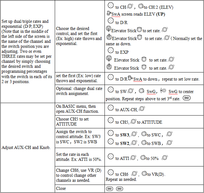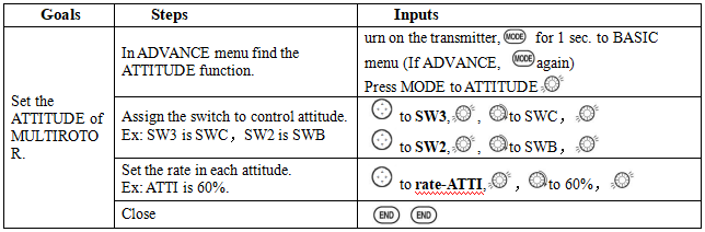 AUX channel for MULTIROTOR is channel 6 to 10, same like ACRO, GLID and HELI, to set auxiliary channel. CH5 is special for ATTITUDE, enter CH5 and press PUSH for ATTITUDE. Select 3-section and 2-section switch to get 6 different attitudes. By DIAL set 6 different rates according to the attitudes.