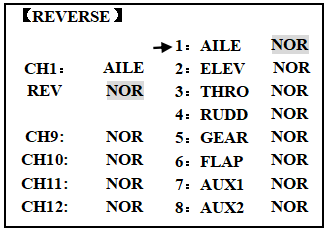 • REVO./NORM: mixes collective pitch commands to the rudder (a PITCH-RUDDER mix) to suppress the torque generated by changes in the main rotor's collective pitch angle, keeping the model from yawing when throttle is applied.