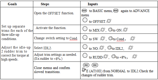 • Activating OFFSET makes the TRIM LEVERS adjust the trim separately in each of the idle-up conditions.