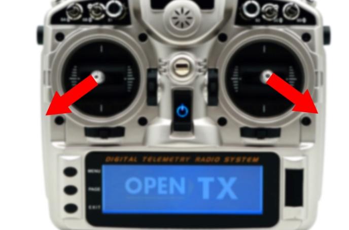 Note: When using a non-RadioLink transmitter, if the attitude calibration is unsuccessful when pushing the left stick (left and down) and the right stick (right and down), please change the direction of the channel in the transmitter. Make sure when pushing the joystick as above, the value range of channel 1 to channel 4 is: