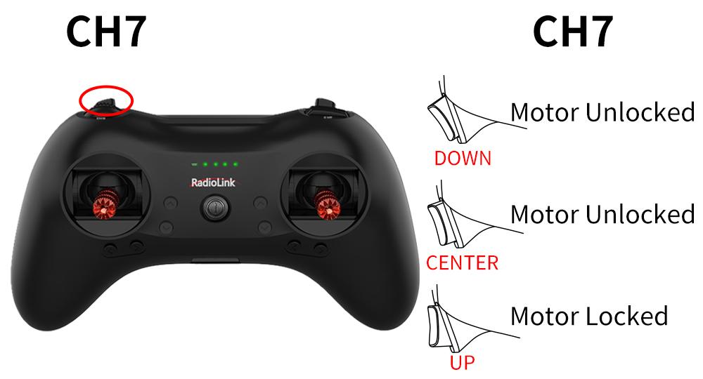Since the PWM value width of each transmitter may be different, when using other transmitters except RadioLink T8FB/T8S, if the unlocking still fails even though the throttle is at the lowest position , you need to increase the throttle travel in the transmitter. You can toggle the switch of channel 7 (CH7) to the motor unlocking position, and then adjust the throttle travel from 100 to 101, 102, 103... until you hear the second long beep from the motor, which means the unlocking is successful. During the process of adjusting the throttle travel, be sure to stabilize the fuselage to avoid injuries caused by blade rotation.