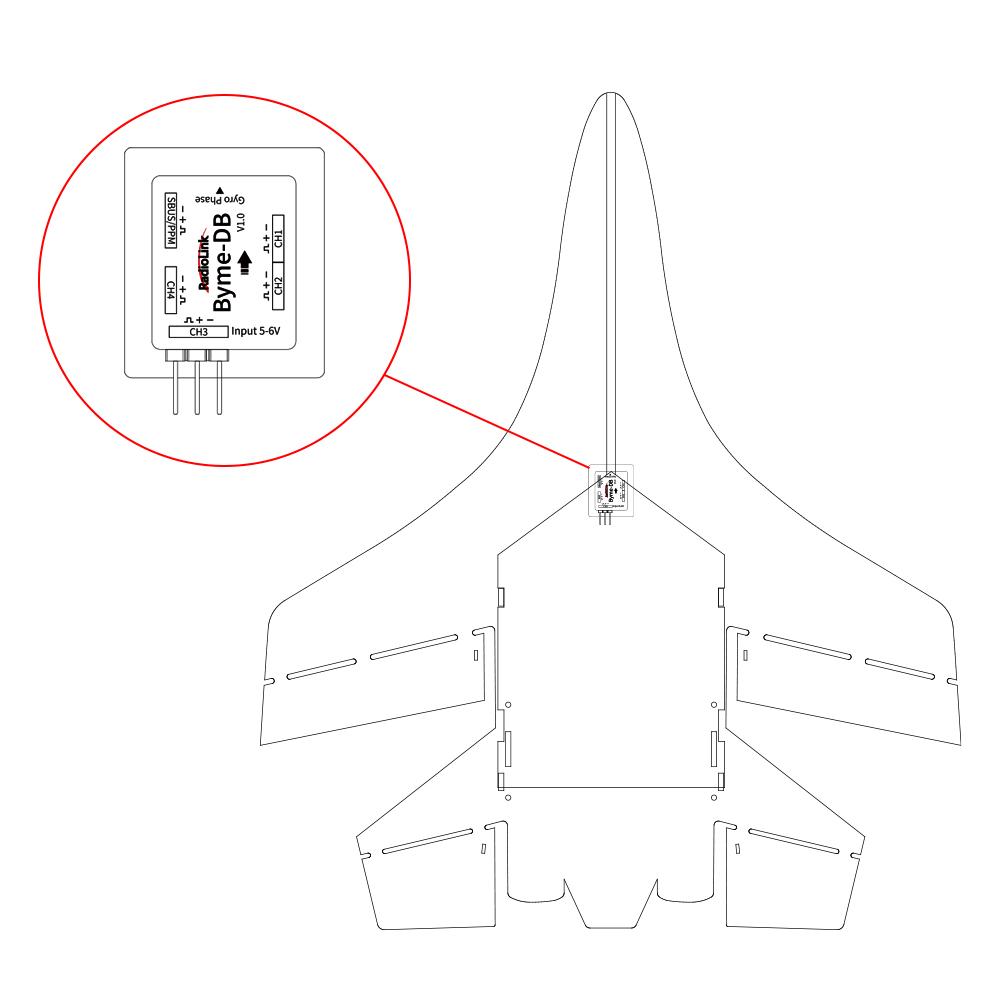 Make sure the arrow on Byme-DB points to the aircraft head. Use 3M glue to flatly attach Byme-DB to the fuselage. It is recommended to install it near the center of gravity of the aircraft. Byme-DB comes with a receiver connect cable which is used to connect the receiver to Byme-DB. When connecting the servo cable and ESC cable to Byme-DB, please check whether the servo cable and ESC cable match the sockets/head of Byme-DB. If they do not match, the user needs to modify the servo cable and ESC cable, and then connect the cables to Byme-DB.
