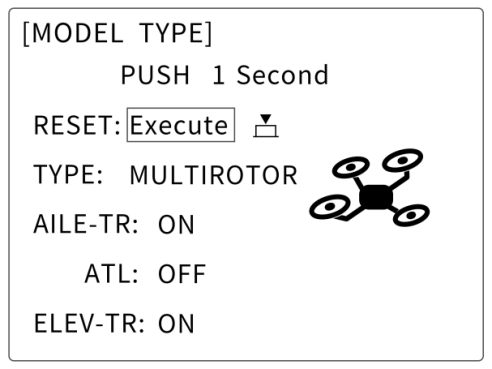 Press “MODE” for more than 1s to enter the BASIC MENU and choose “MODEL TYPE”, rotate the dial to select “MULTIROTORS”and press “PUSH”to save, then “END”to exit.
