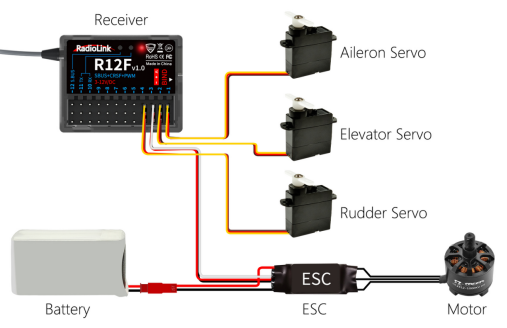 RadioLink R12F, 12-channel receiver, 2.4G FHSS spread spectrum algorithm and 67-channel pseudo-random frequency hopping, supports PWM, SBUS and CRSF signal. It is high voltage servo supported and can get the new functions by updating the firmware. R12F is compatible with RadioLink T16D/T12D/T8FB/T8S/RC8X/RC6GS V3/RC4GS V3/RC6GS V2/RC4GS V2/RC6GS/RC4GS transmitters.
