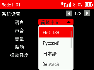 A: Long press Mode button to enter MAIN MENU主菜单, select 遥控器设置--系统设置--语言, and set English. The menu language will be changed into English.