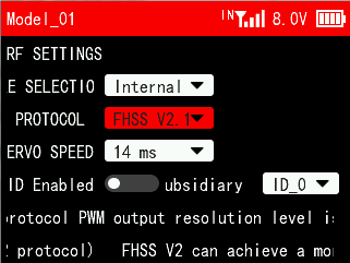 A: FHSS V1 and FHSS V2 protocols support 8 channels, but FHSS V2.1 protocol supports 16 channels. When using R16F and 12F, if FHSS V1 or FHSS V2 protocol is selected, only 8 channels are available on the receiver. Please enter MAIN MENU--Receiver Settings--RF SETTINGS--PROTOCOL, and select FHSS V2.1 protocol.