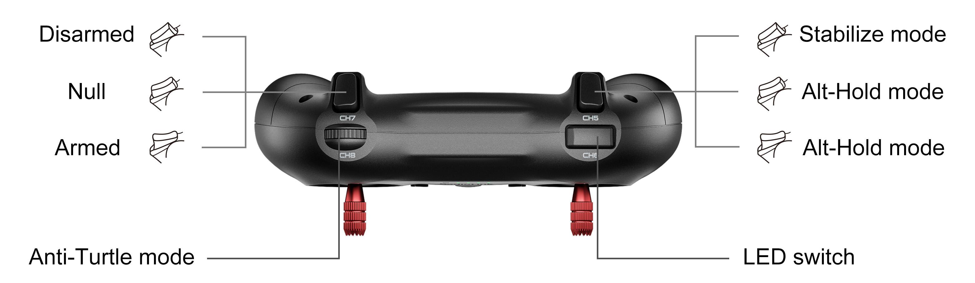 CH5 three-position switch controls the two flight modes: stabilize mode and alt-hold mode. When the CH5 switch is moved to the bottom, it is in stabilize mode. When CH5 switch is in the center or moved to the direction of CH6 push-button (the top), it is in alt-hold mode. After the drone is turned over, turn CH8 knob-switch fully clockwise to activate the anti-turtle mode. In anti-turtle, the tail LED will flash colored lights.