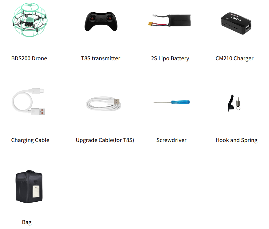 Power for BDS200: The voltage of 2S LiPo battery packed with BDS200 is not fully charged by default, so the battery needs to be charged with the charger CM210 before flight.