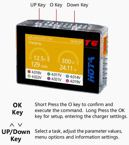 Connect power supply to the charger's PD or DC port, wait for the system to complete the self-checking. In standby interface, connect the battery to the charger. Short Press OK key to pop up the“Task Settings”menu, press the Up/Down key to select the operation task and adjust the task parameters, short press OK key to start the task.