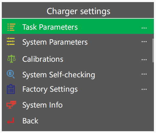 In standby interface, long press the OK key to enter the“Charger Settings”menu.