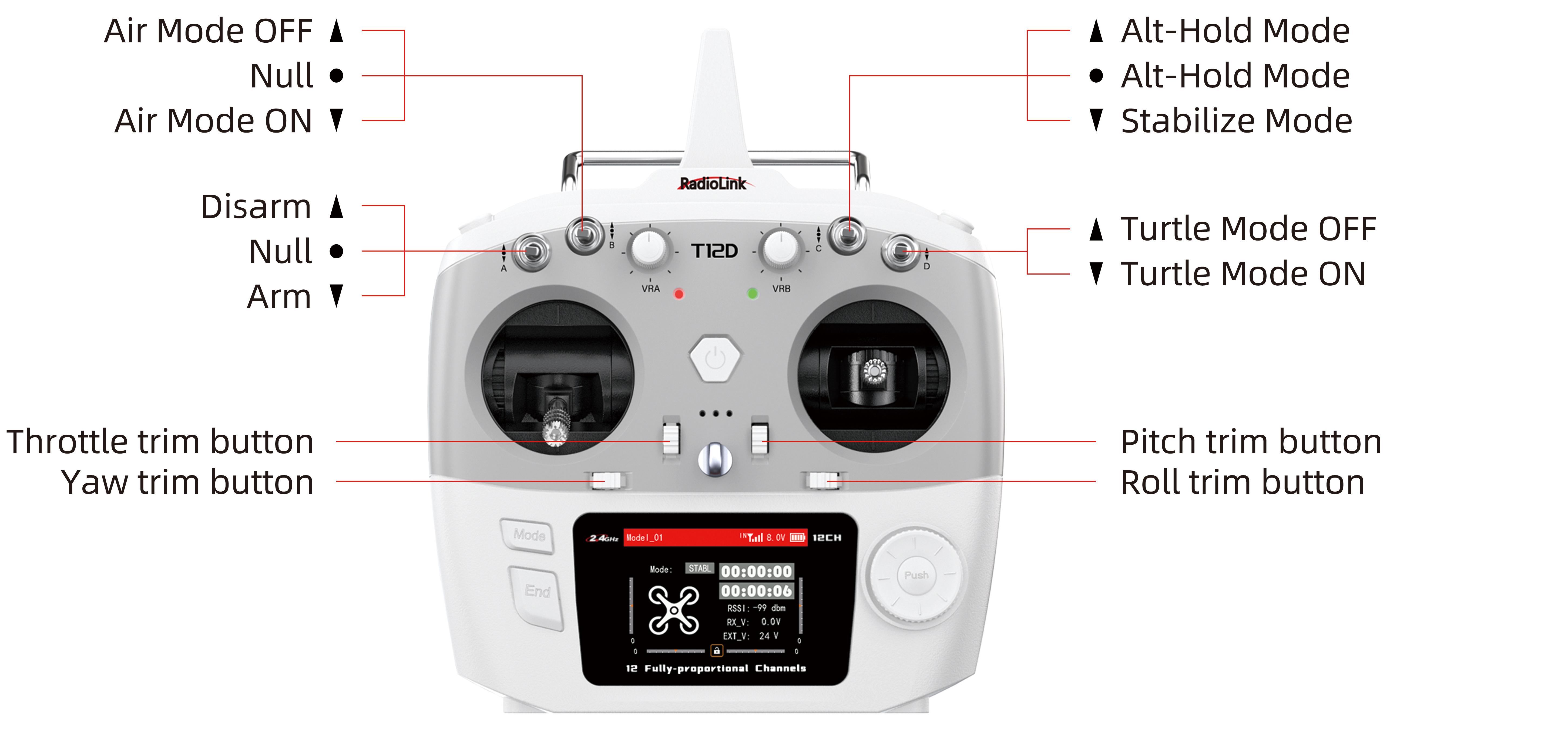 Note: All of the following are based onT12D Mode 2 (Throttle on the left stick).