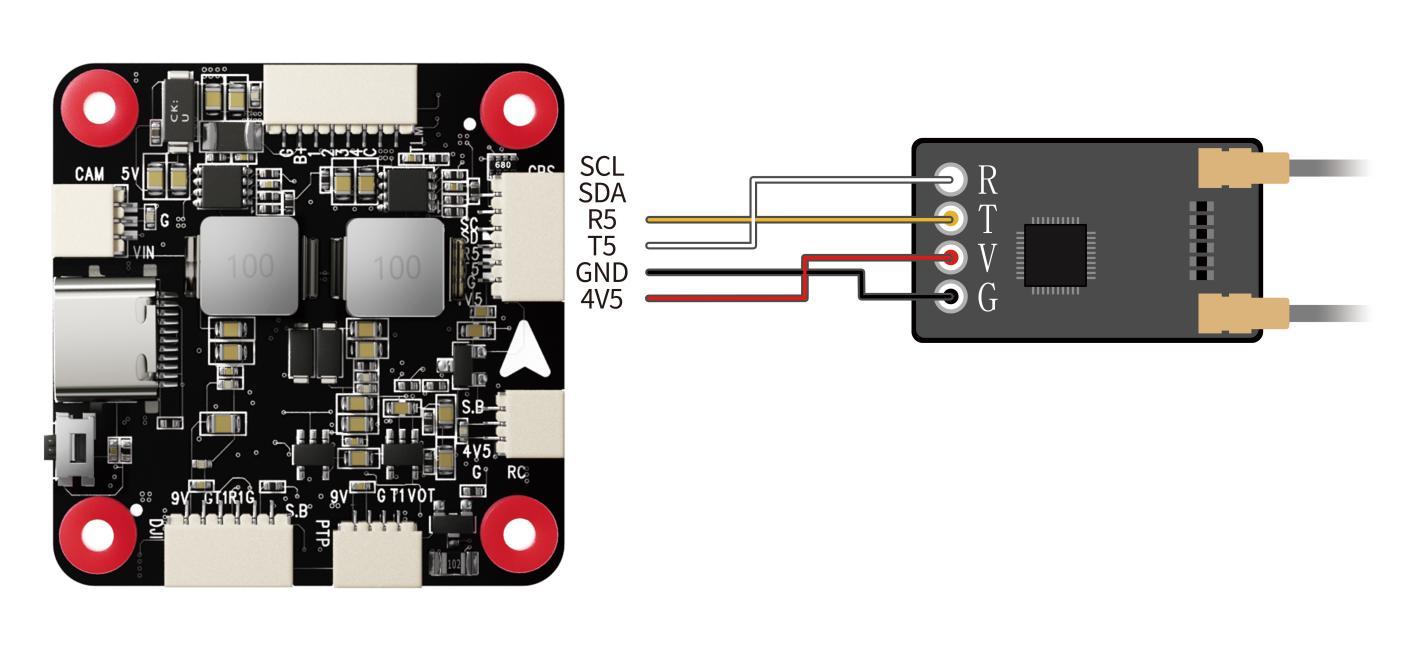 If SBUS receiver is used with LDZ-A40, please connect SBUS receiver to the SBUS receiver connect port of the flight controller (As shown below. RadioLink R8SM receiver is used as an example). Since the factory configured receiver serial port is serial port 5 (for ELRS receiver), you need to modify the settings when using the SBUS receiver, otherwise there will be conflict between the SBUS serial port and the ELRS receiver serial port, resulting in the failure of the communication between the transmitter and receiver.