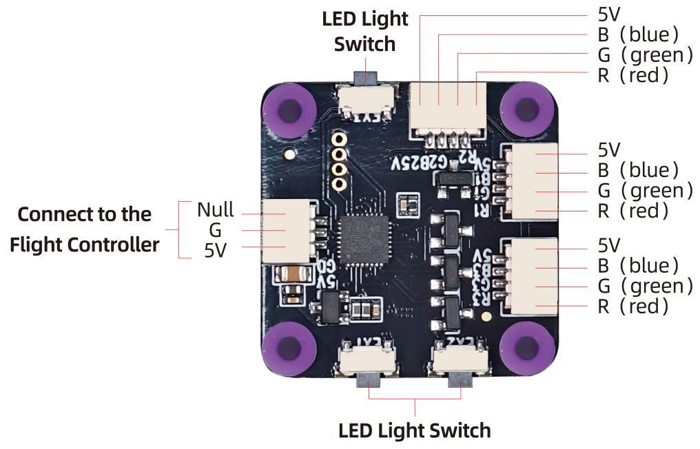 LDZ-A40 has a tail LED light and a ring light strip. They have 7 colors that can be switched, namely red, green, blue, yellow, purple, cyan and white. Short press the button on the light board to switch their light color or turn off the light.