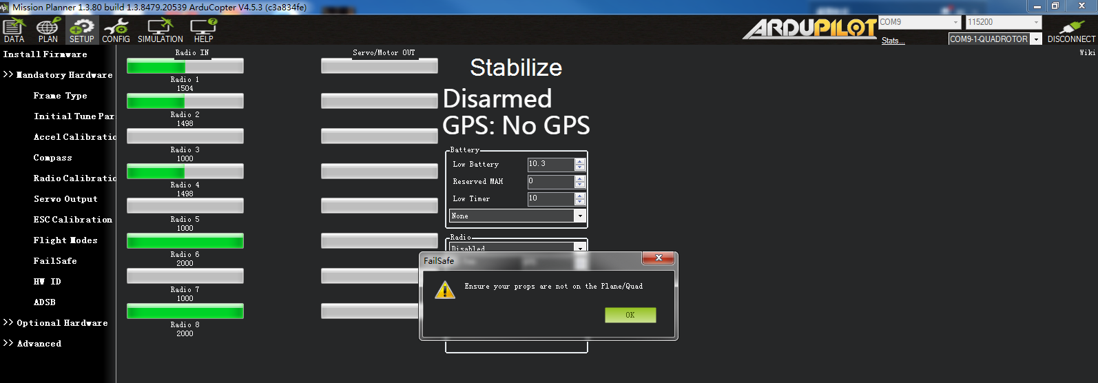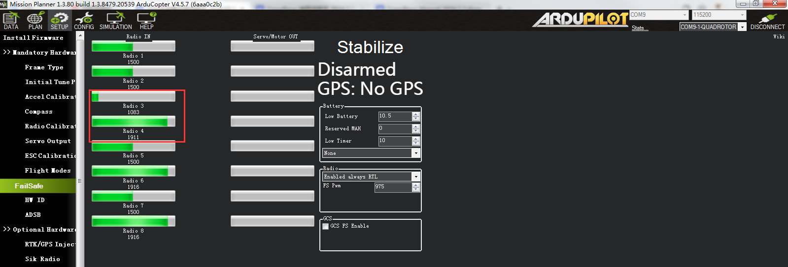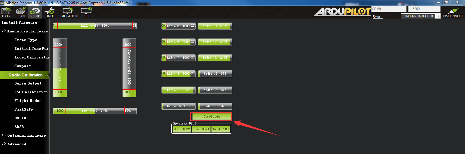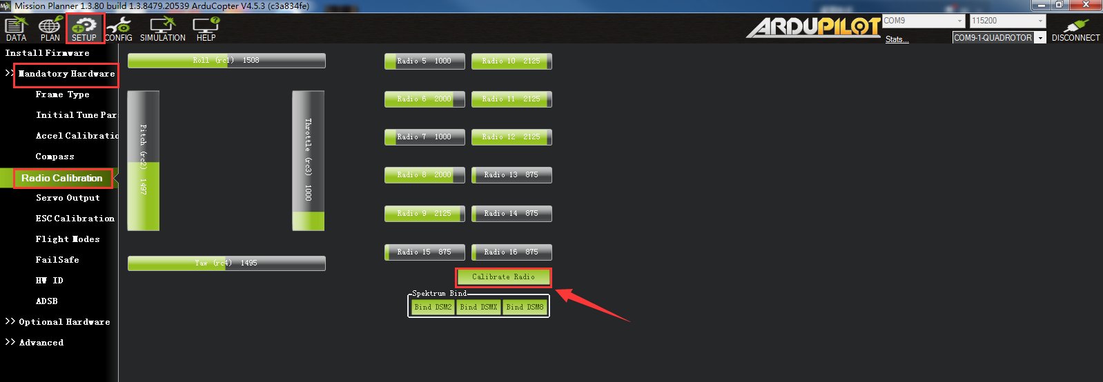 Connect flight controller to Mission Planner, and connect receiver to finish the calibration of transmitter, Accelerometer and compass.