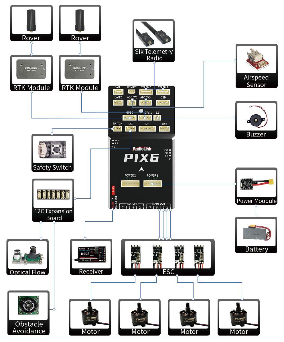 OSD is the abbreviation of On Screen Display in English. It is a kind of screen display technology, which is used to display characters, graphics and images on the display terminal. The status of the aircraft can be displayed in the returned video, and the data of each module can be integrated into the OSD module, and then the OSD module can return the monitored data to the terminal (FPV glasses or screen) and superimpose it on the video transmission image. PIX6 flight controller integrates an OSD chip. Users do not need to connect an external OSD module. They only need to connect the signal lines corresponding to the image transmission and camera to the OSD port of PIX6 to use the OSD function.