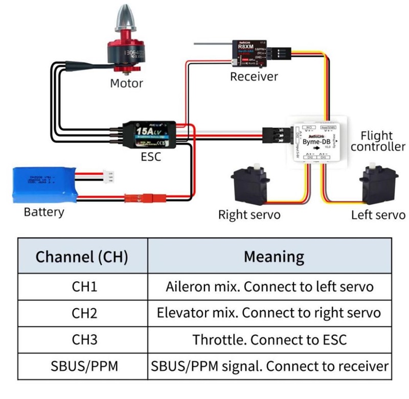 Note: Do not set any mixing in the transmitter when Byme-DB is mounted on the aircraft. Because there is already the mixing in Byme-DB. The mix control will automatically take effect according to the flight mode of the aircraft. If the mixing function is set in the transmitter, there will be conflicts of mixing and affect the flight.