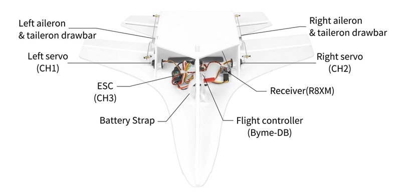 SU27 is installed with the flight controller Byme-DB by default. When installing or replacing the flight controller, make sure the arrow on Byme-DB points to the aircraft head. Use 3M glue to flatly attach Byme-DB to the fuselage. It is recommended to install it near the center of gravity of the aircraft. If the flight control is not installed stably, the aircraft will vibrate abnormally when flying in stabilize and gyro modes. Refer to the picture below to connect the flight controller, servos, receiver, ESC, motor, and battery.