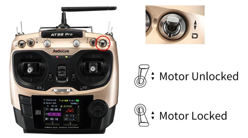 Take the RadioLink AT9S Pro transmitter as an example. The motor lock is controlled by CH7 (2-way switch, SWD) as below: