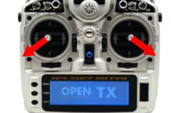 Note: When using a non-RadioLink transmitter, if the attitude calibration is unsuccessful when pushing the left stick (left and down) and the right stick (right and down), please change the direction of the channel in the transmitter. Make sure when pushing the joystick as above, the value range of channel 1 to channel 4 is: CH1 2000 µs, CH2 2000 µs, CH3 1000 µs, CH4 1000 µs